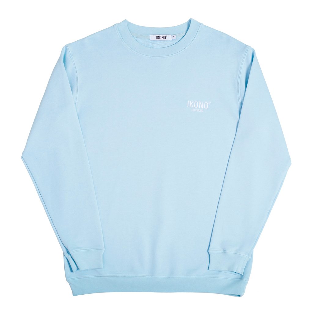 Baby blue unisex sweater with "IKONO® CITY CLUB" embroidery on the left chest. Sizes run large, scale down 1 size for a tighter fit.