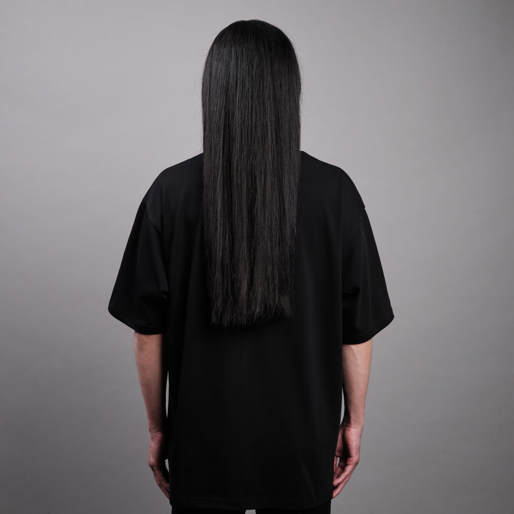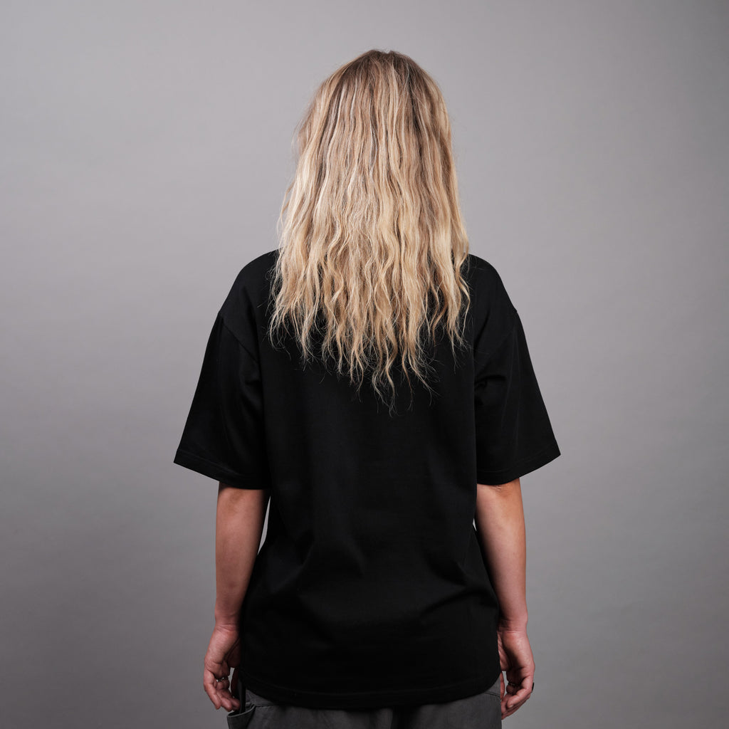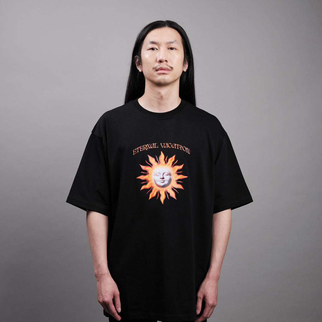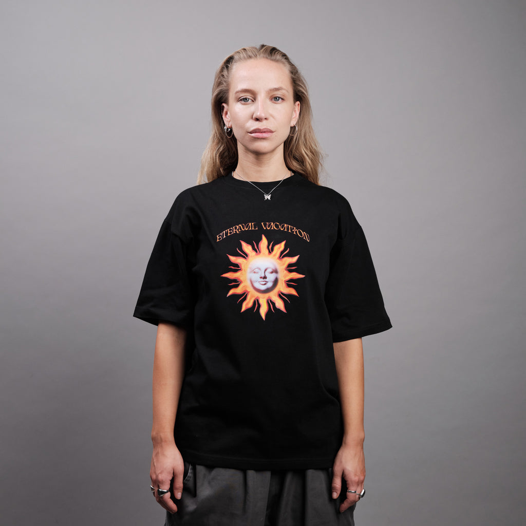 Black oversize t-shirt with "Eternal Vacation" print on chest