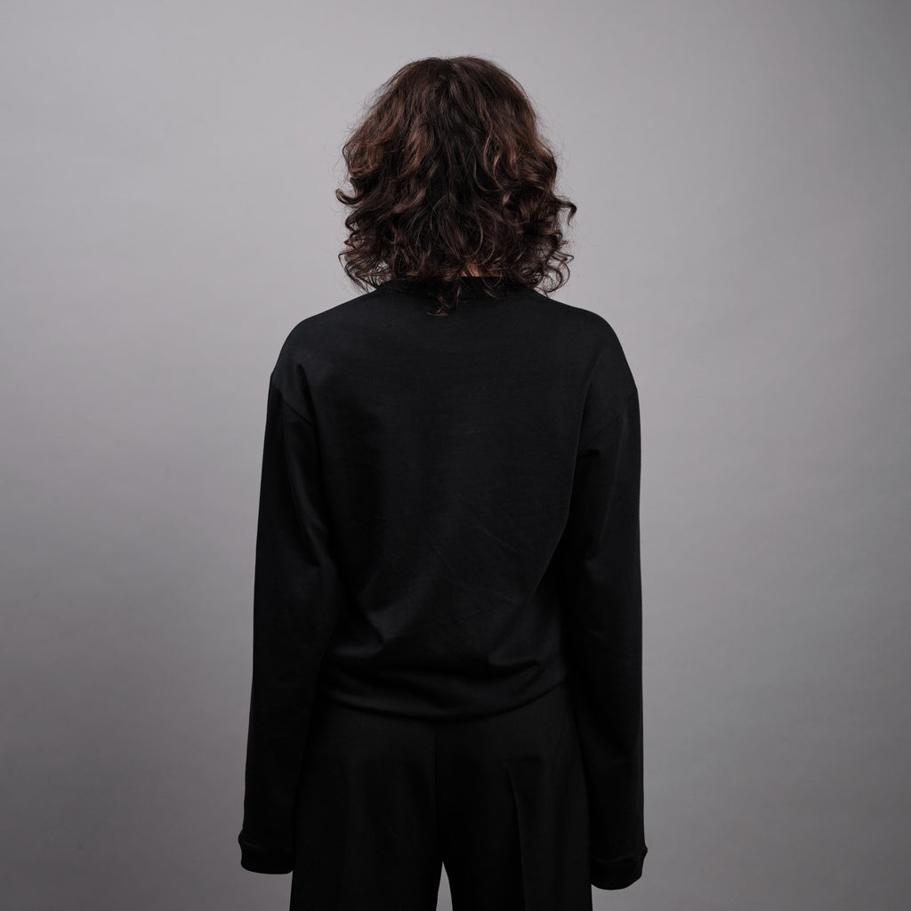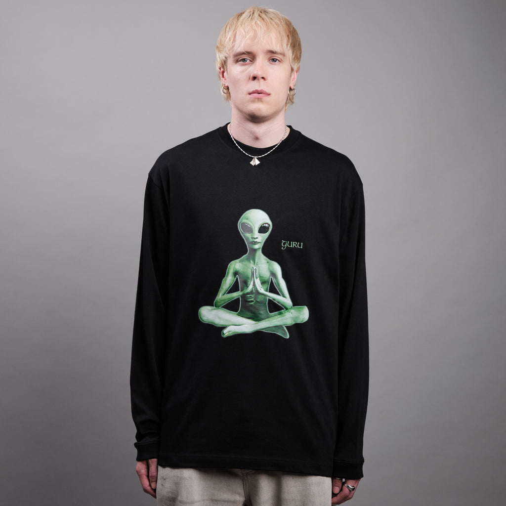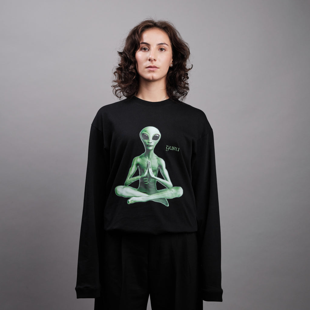 Black oversize long sleeve with alien print + embroidered "guru" text