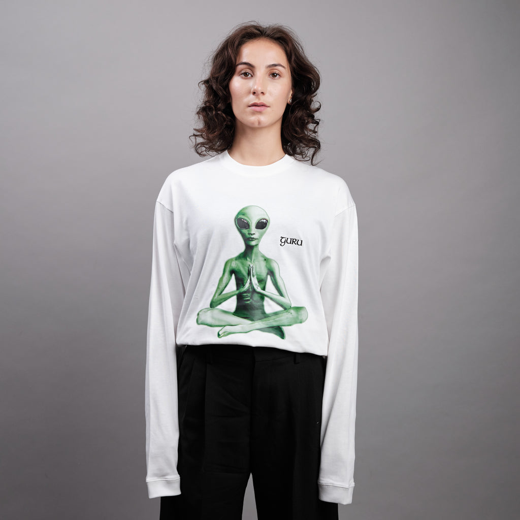 White oversize long sleeve with alien print + embroidered "guru" text