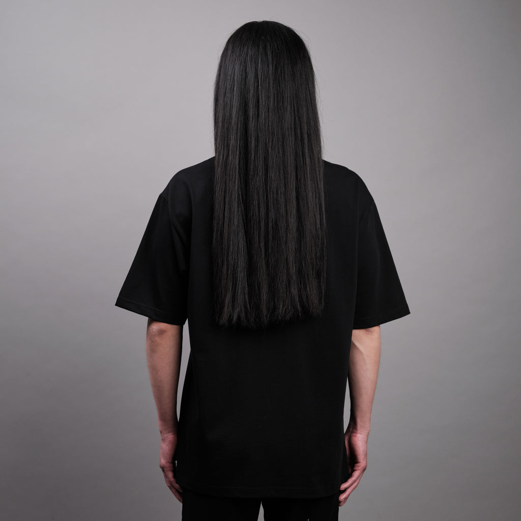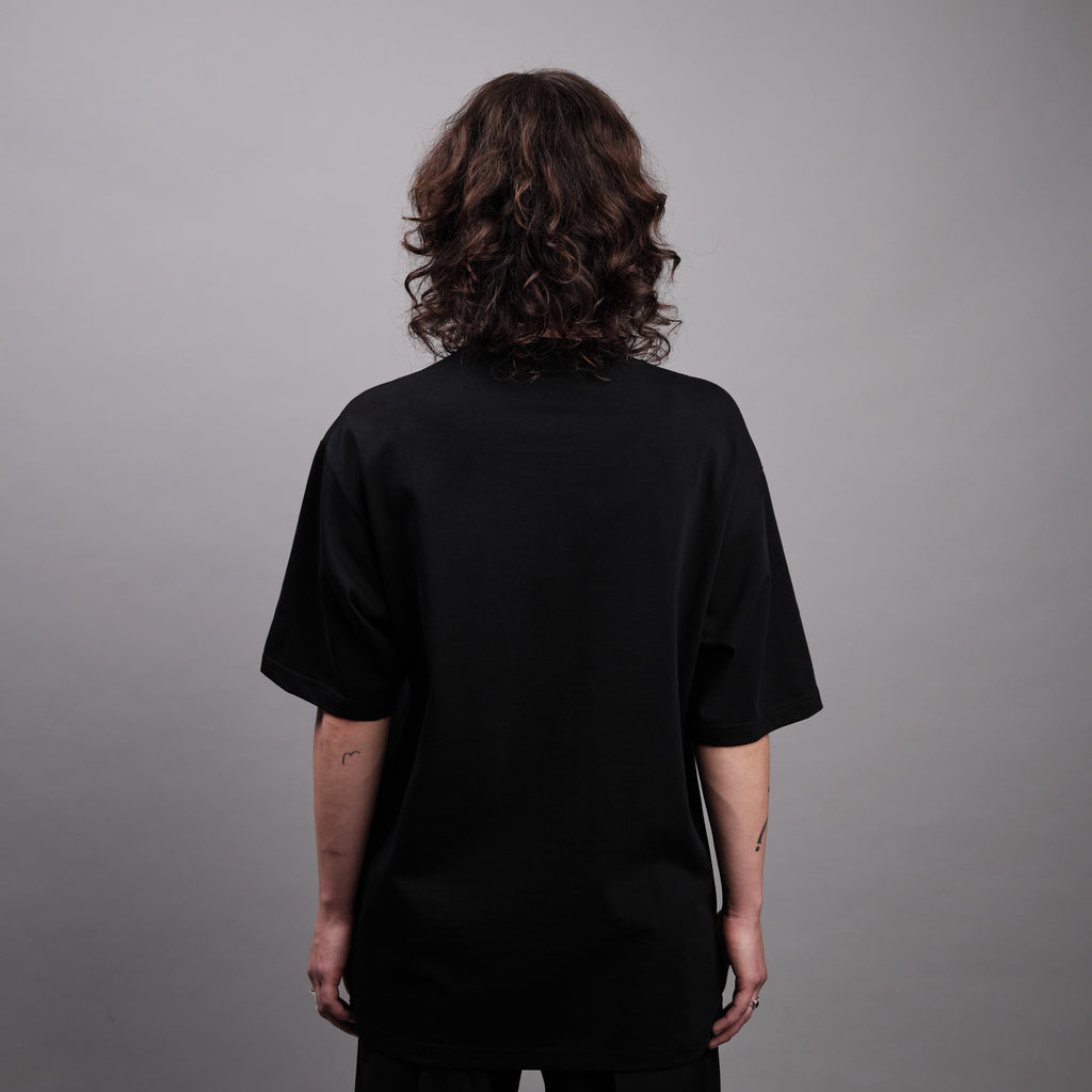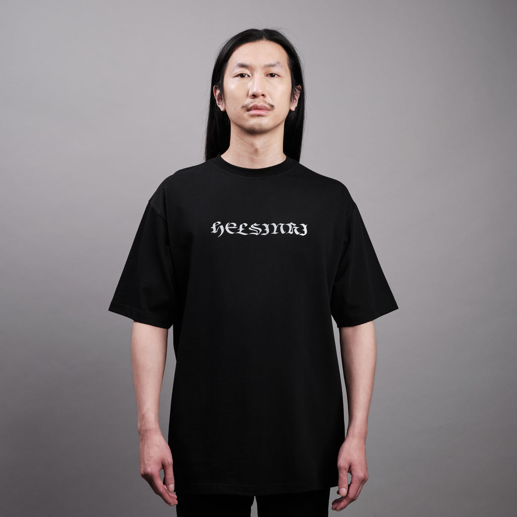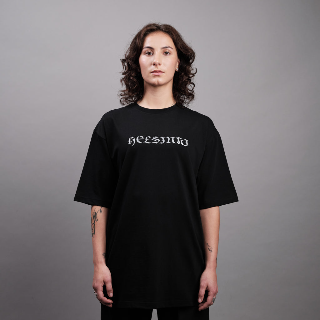 Black oversize t-shirt with reflective "Helsinki" print on chest