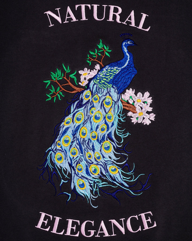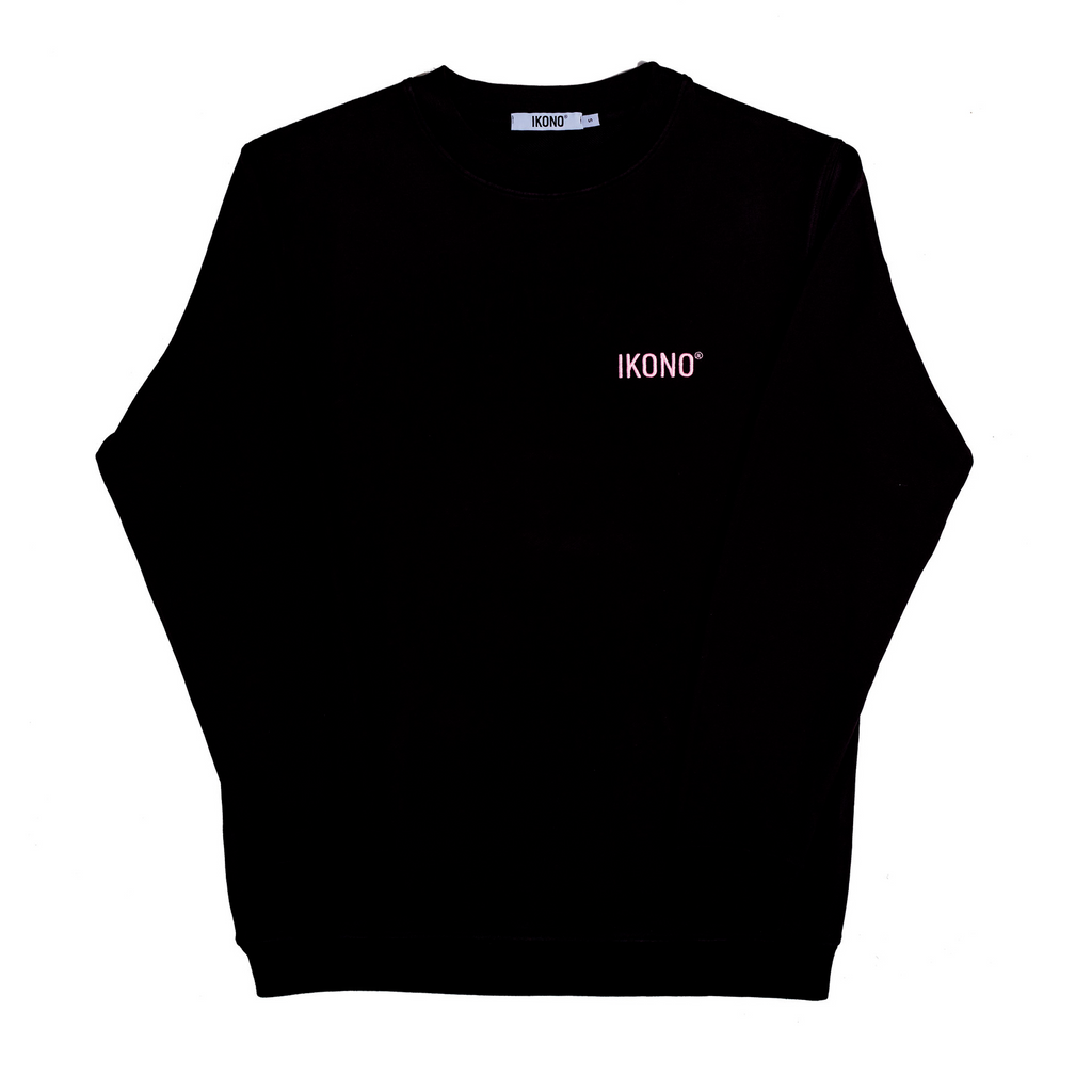Black Unisex Sweater with IKONO®-embroidery in front and Natural Elegance-embroidery on the back. Sizes run large, scale down 1 size for a tighter fit.