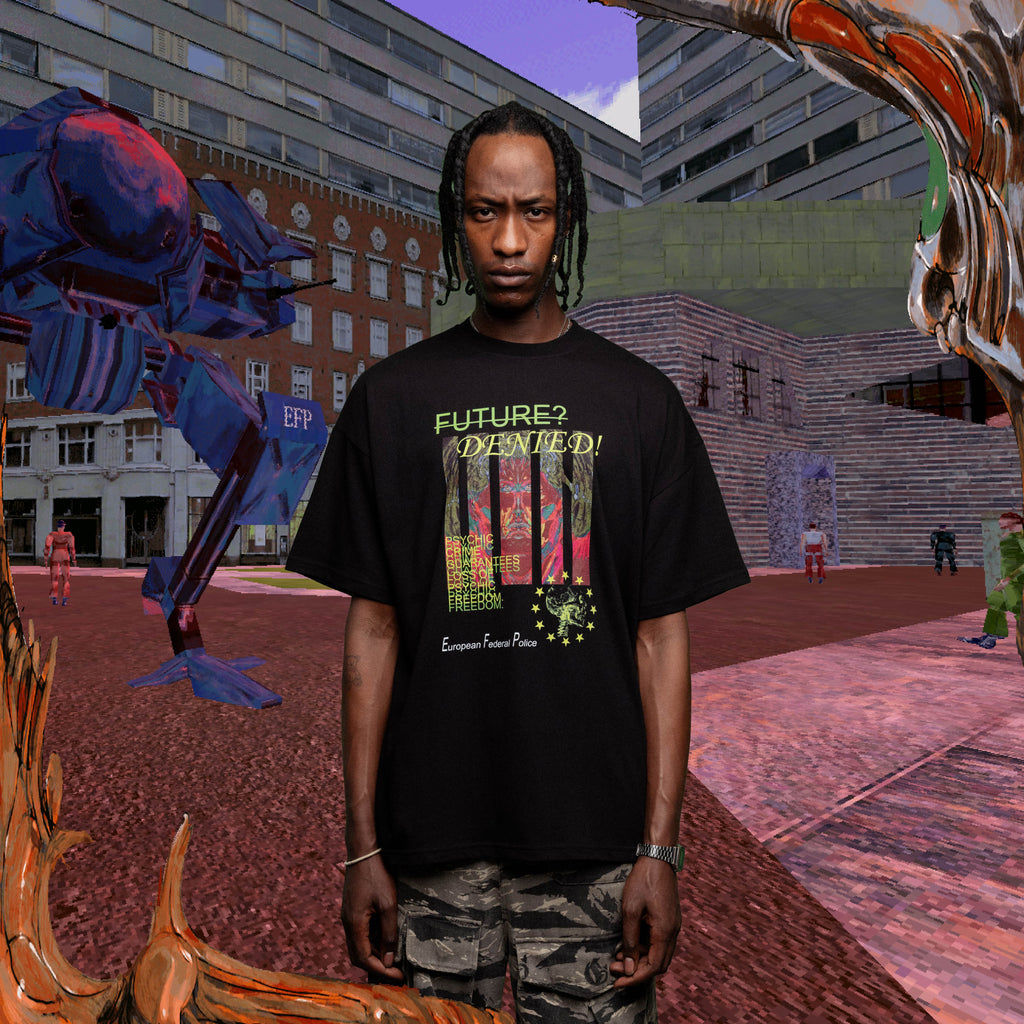 Black oversize t-shirt with Future Denied -print from Psycho Patrol R by Consumer Softproducts.